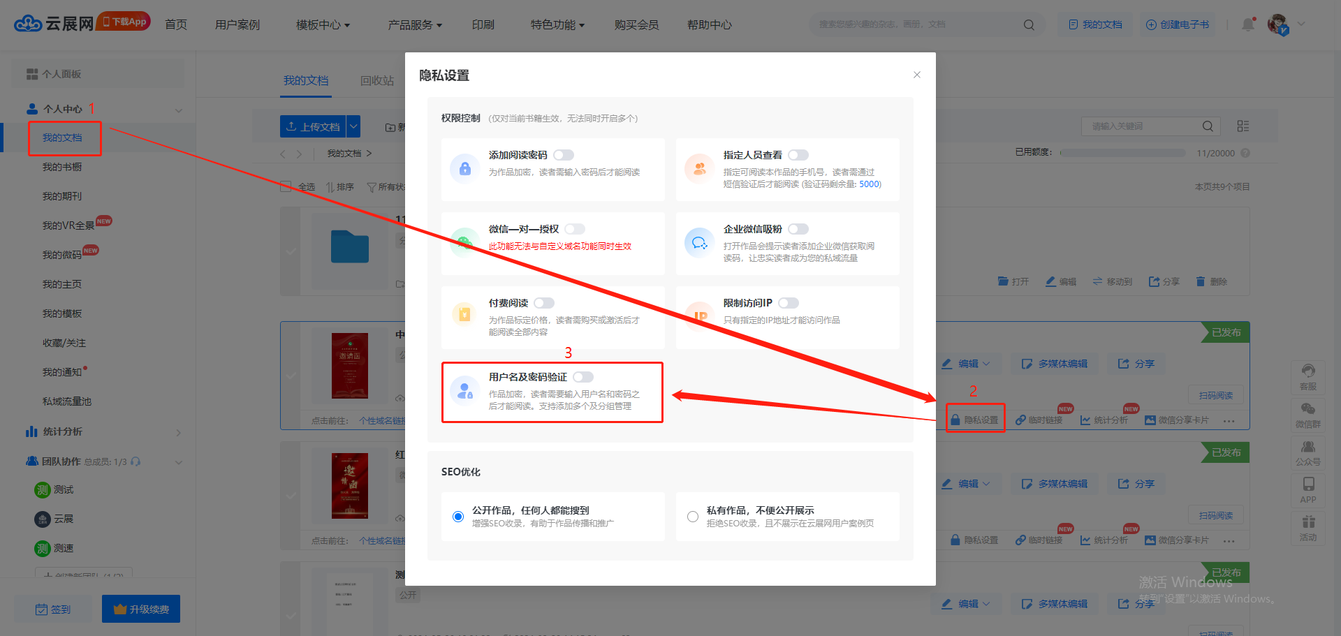 點擊【我的文檔】,選擇要設(shè)置的書本,點擊【隱私設(shè)置】,打開【用戶名及密碼驗證】。