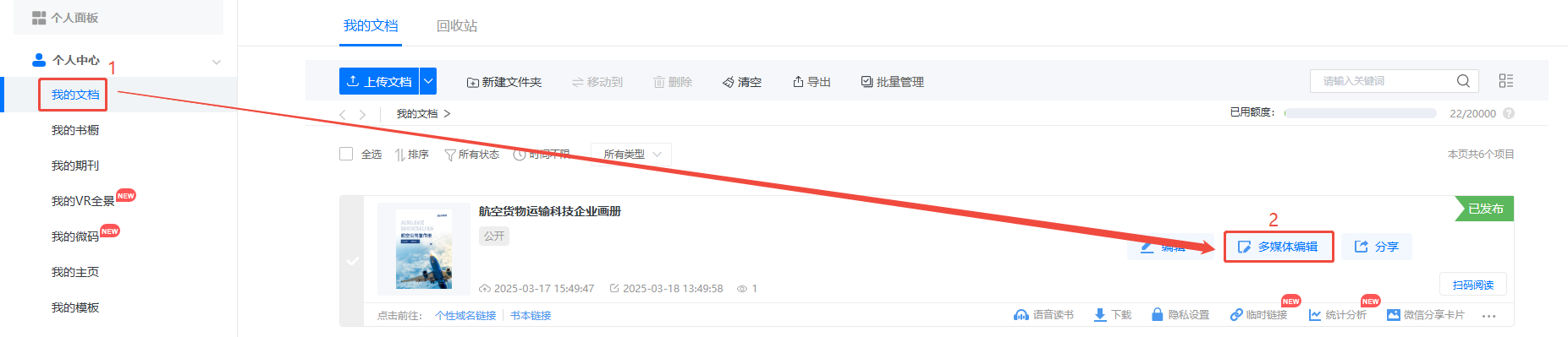 點(diǎn)進(jìn)【我的文檔】/【文檔】,選擇對(duì)應(yīng)電子書,點(diǎn)擊【多媒體編輯】/【內(nèi)容編輯】。