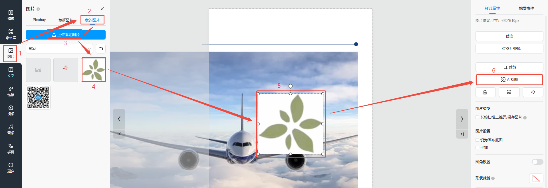 點(diǎn)擊【圖片】,再點(diǎn)擊【我的圖片】,然后點(diǎn)擊【上傳本地圖片】,將圖片上傳到下方素材庫(kù)中,點(diǎn)擊素材庫(kù)中的圖片,圖片會(huì)出現(xiàn)在頁(yè)面上,選中頁(yè)面上的圖片,最后點(diǎn)擊右側(cè)【AI摳圖】,打開AI摳圖界面。