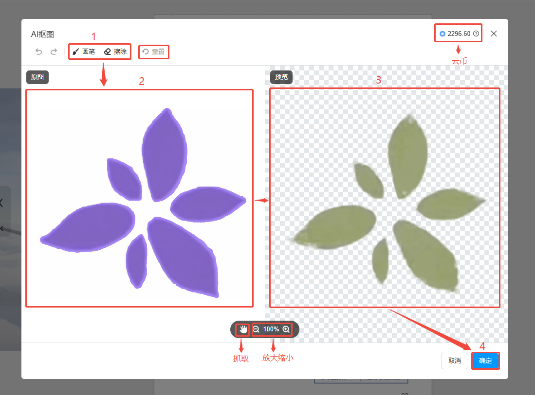在左側(cè)原圖區(qū)域,紫色部分為摳出來(lái)的部分,可以用畫筆涂畫出想要摳出來(lái)的部分或者擦除不想摳出來(lái)的部分,右側(cè)預(yù)覽區(qū)域查看最終效果,點(diǎn)擊右下角確定。