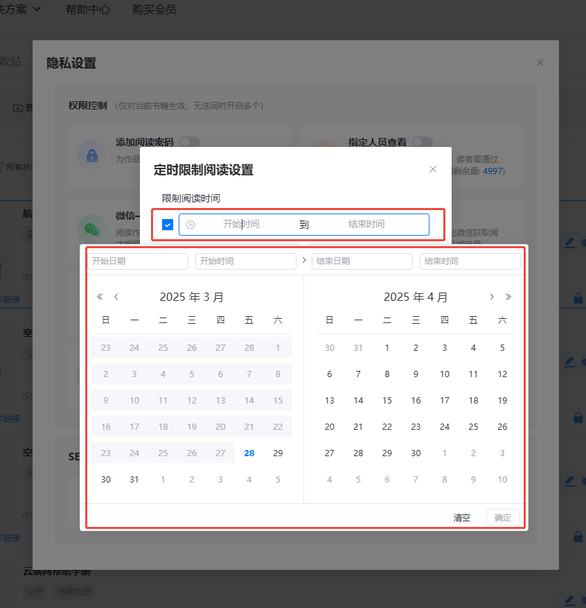 設置開啟日期時間和結束日期時間,在設置的這段時間內,書本無法閱讀。