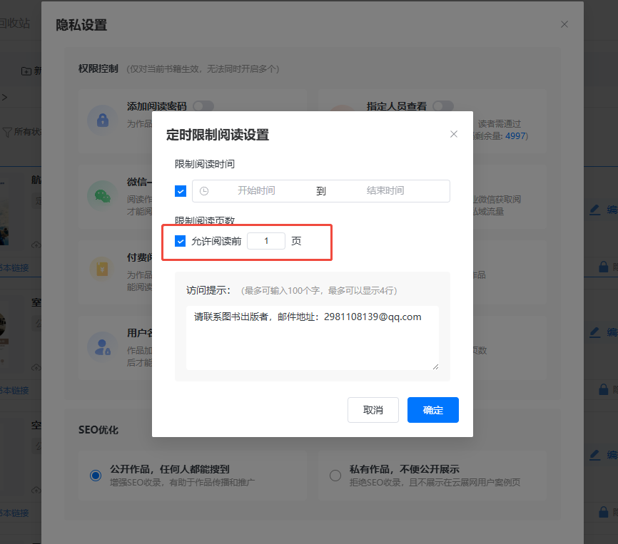 如果想要在限定的時間段內讀者可以試看,可以設置允許閱讀前幾頁。