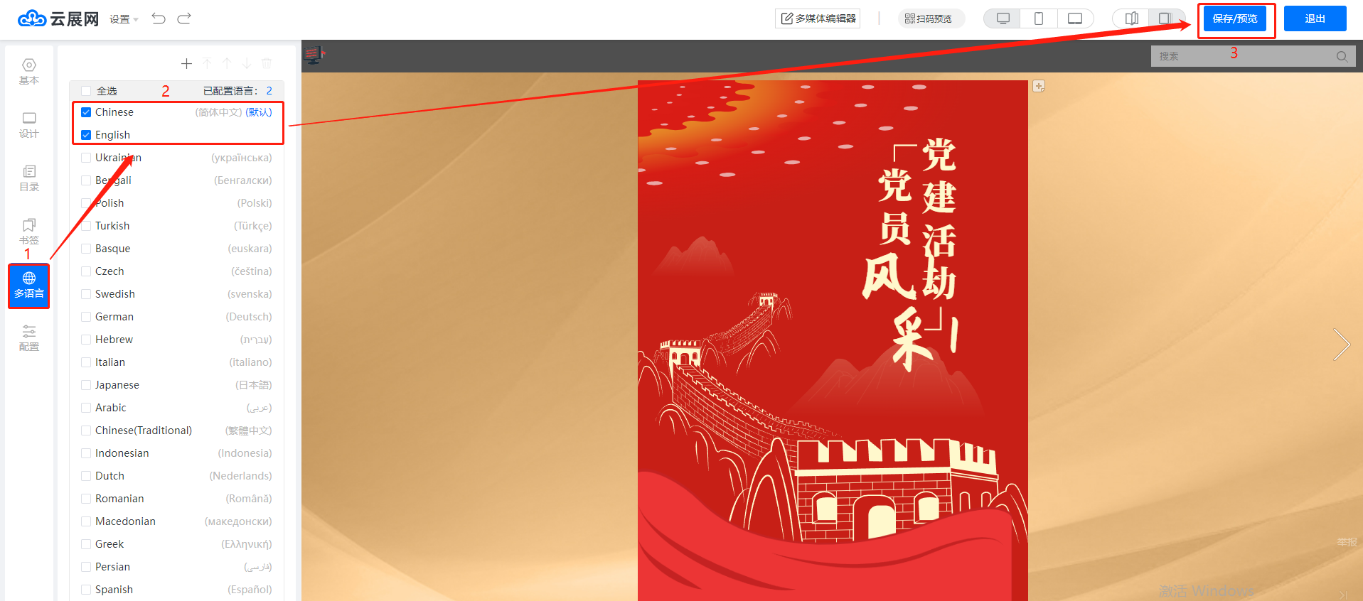 點(diǎn)擊【多語言】,勾選需要給讀者選擇的語種,點(diǎn)擊【保存/預(yù)覽】。