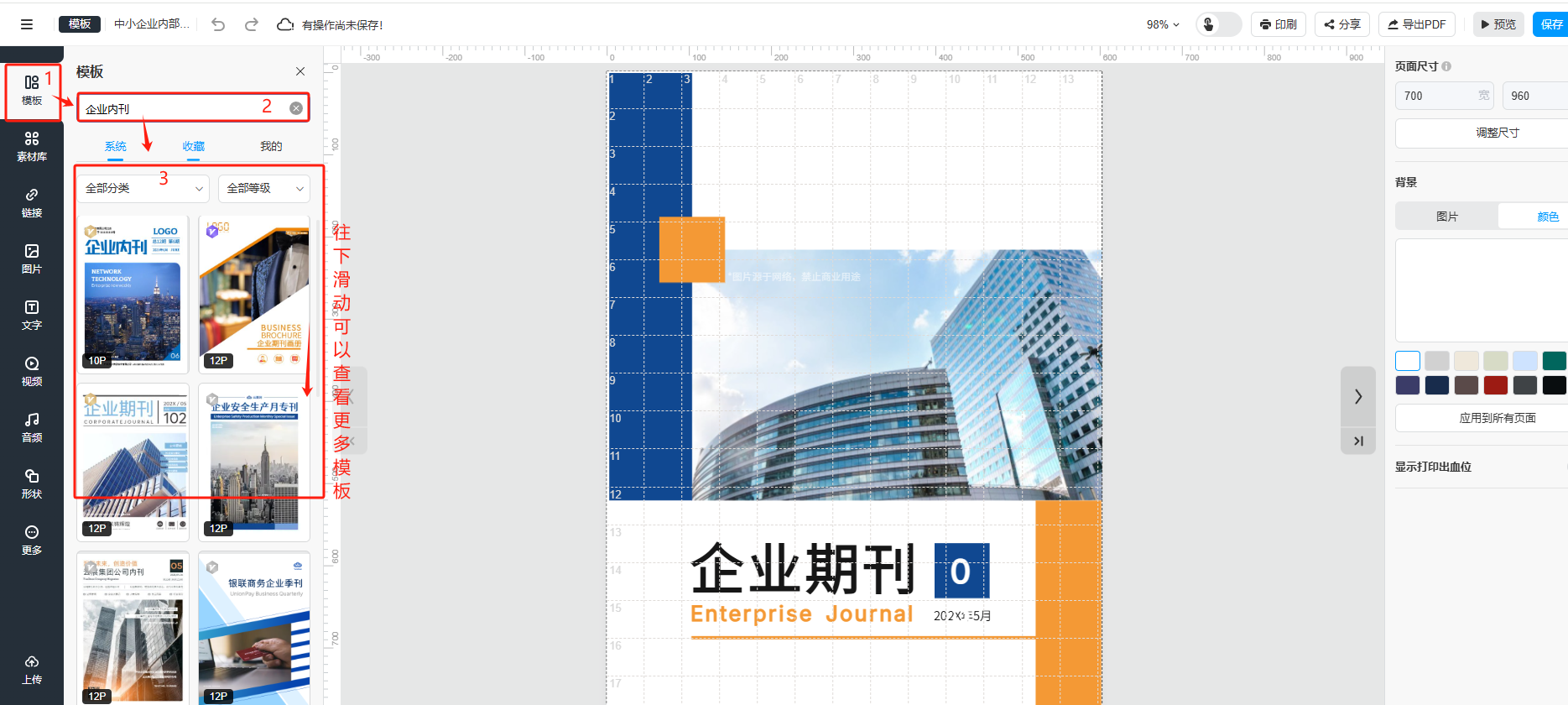 (1)在編輯器頁面,點(diǎn)擊左邊的【模板】,輸入關(guān)鍵字搜索后,往下滑動(dòng)可以瀏覽更多模板