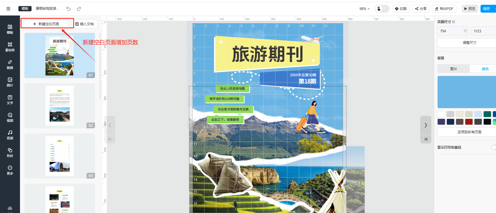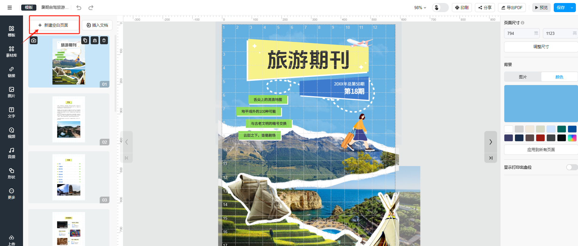 (2)進(jìn)入編輯器頁面后,點(diǎn)擊【新建空白頁面】,新增一頁空白頁可以自由編輯