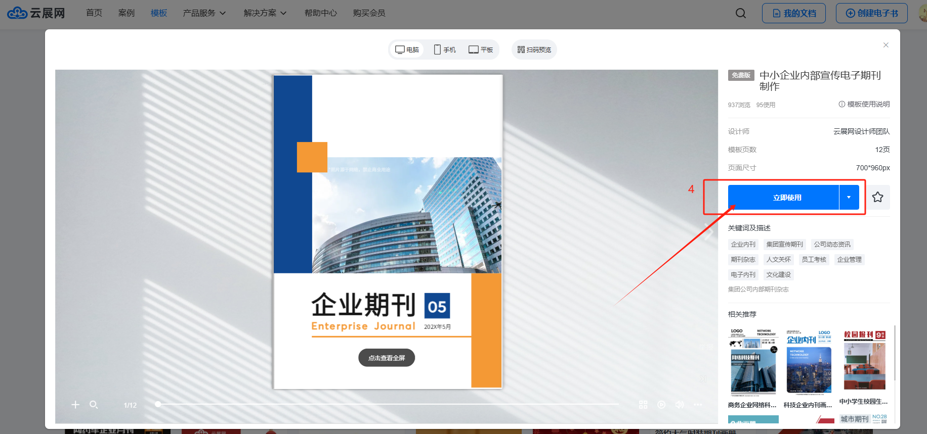 (1)在【模板】頁面,檢索關(guān)鍵詞選擇一款心儀的模板,點(diǎn)擊【立即使用】