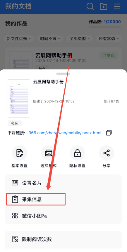 點(diǎn)擊【作品】,點(diǎn)擊對(duì)應(yīng)電子書右邊的三個(gè)點(diǎn),然后點(diǎn)擊【采集信息】,打開采集信息界面。