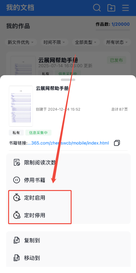 點(diǎn)擊【作品】,點(diǎn)擊對(duì)應(yīng)電子書右邊的三個(gè)點(diǎn),然后根據(jù)需要點(diǎn)擊【定時(shí)啟用】或者【定時(shí)停用】,打開(kāi)界面。
