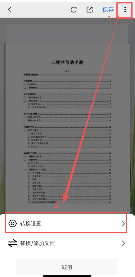 點(diǎn)擊右上角“三個(gè)點(diǎn)按鈕”,點(diǎn)擊【轉(zhuǎn)換設(shè)置】打開