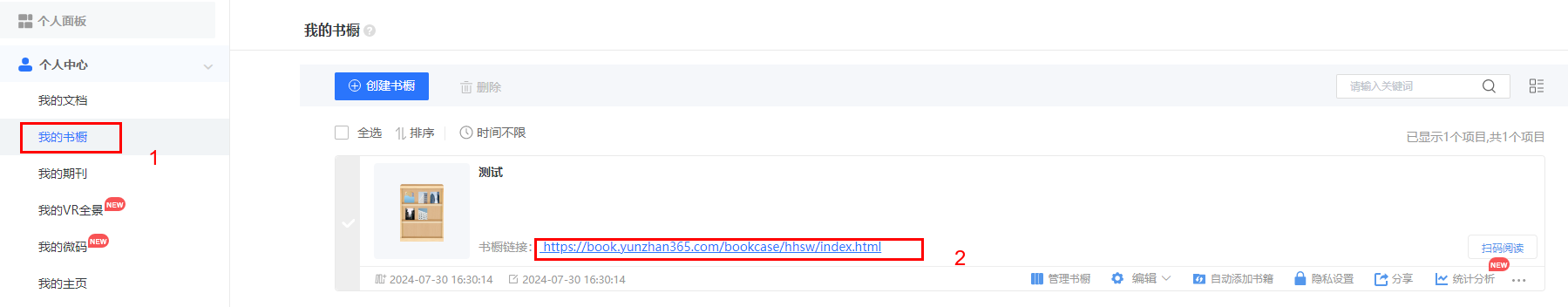 點擊【我的書櫥】,復(fù)制書櫥鏈接。如這個書櫥鏈接為:https://baijingtest.sharedbook.cn/bookcase/qbba/index.html