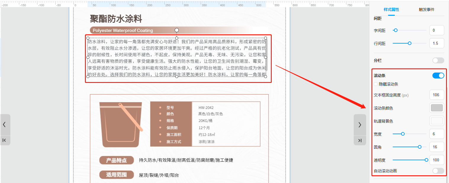當(dāng)文字段落太長(zhǎng),又不想它占據(jù)頁(yè)面太多面積時(shí),可以選中文本框并打開【滾動(dòng)條】,這樣可以縮小文本框的面積,讀者可以滑動(dòng)觀看后面的內(nèi)容。
