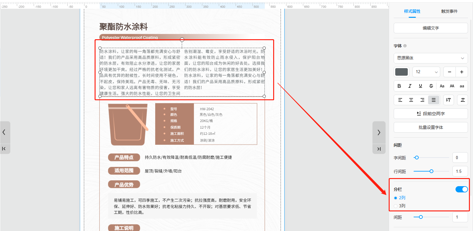 選中你所需要修改的文本框,打開【分欄】,文字段落會(huì)自動(dòng)分成對(duì)應(yīng)數(shù)量的欄目。