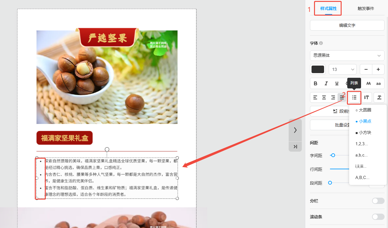 雙擊文本框進(jìn)入編輯狀態(tài),點(diǎn)擊【列表】選擇符號(hào)樣式,文本里的每一段前面將會(huì)添加一個(gè)符號(hào)。