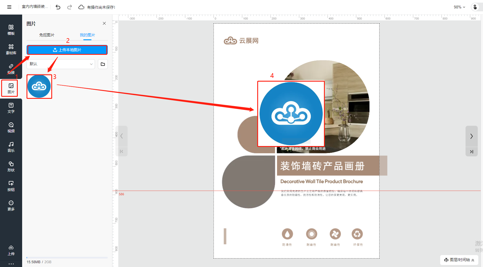 選擇【圖片】進(jìn)入圖片界面,點(diǎn)擊【上傳本地圖片】,選擇電腦上的圖片進(jìn)行上傳,上傳成功的圖片會(huì)出現(xiàn)在下方圖片欄,再次點(diǎn)擊一下圖片,圖片會(huì)直接出現(xiàn)在頁面上,點(diǎn)擊拖動(dòng)可以調(diào)整位置,也可以調(diào)整大小。