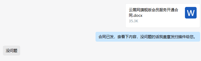 客服生成合同后,會將生成的合同發(fā)給甲方確認,如甲方確認合同沒問題,客服會打印蓋章發(fā)掃描件給甲方。