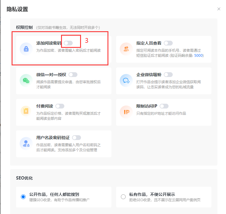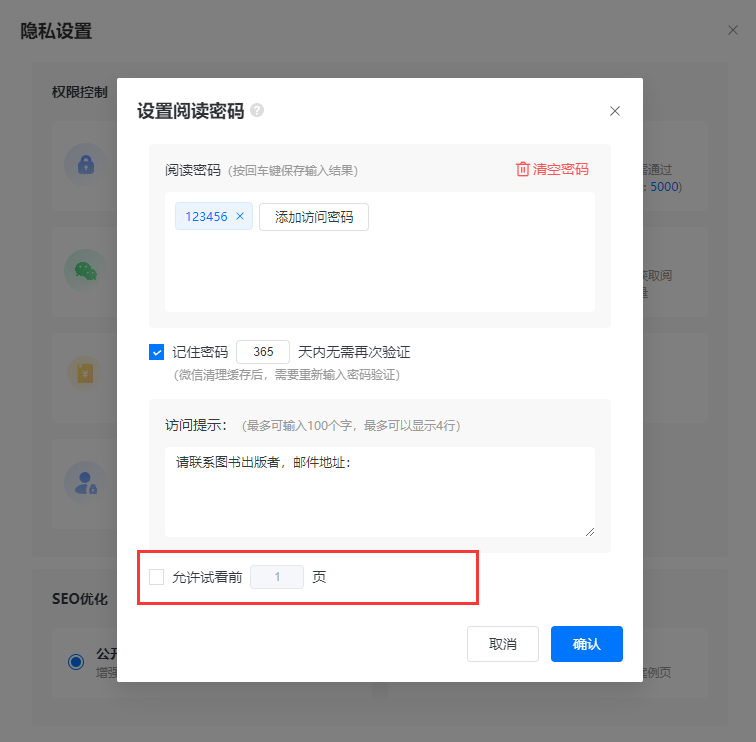 如果你想允許讀者看幾頁之后再要求輸入密碼,可設(shè)置一下允許查看幾頁。