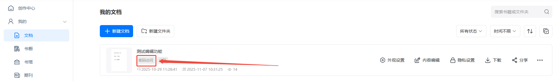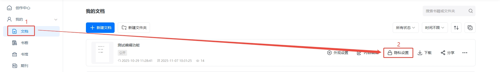 點(diǎn)擊【文檔】需要添加閱讀密碼的電子書,點(diǎn)擊【隱私設(shè)置】,勾選【添加閱讀密碼】。
