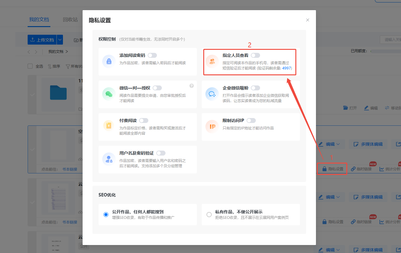 找到需要設(shè)置指定人員查看的電子書,點擊【隱私設(shè)置】。開啟【指定人員查看】選項。