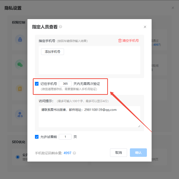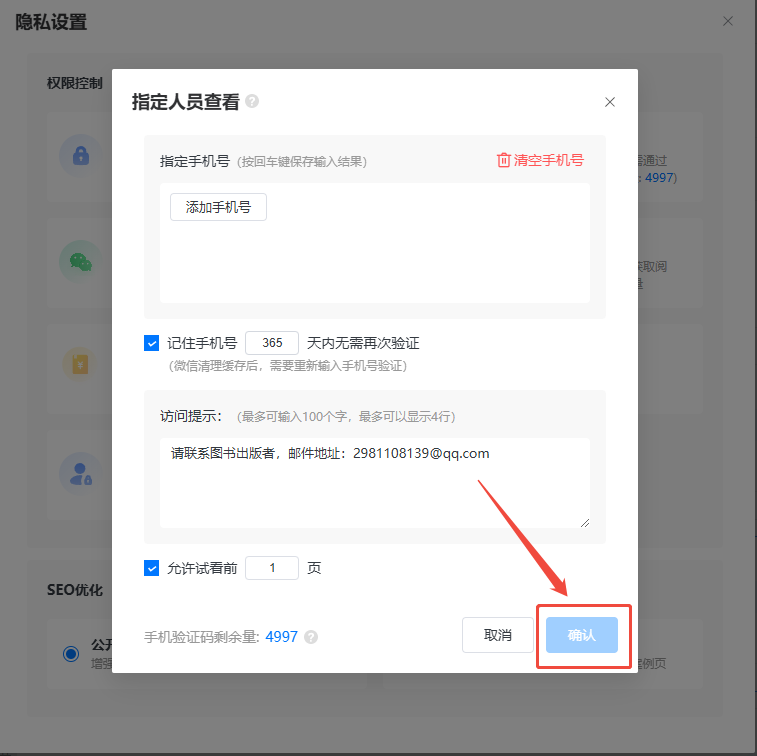 如果你想允許讀者看幾頁之后再要求輸入手機(jī)號驗證,可設(shè)置一下允許查看幾頁。