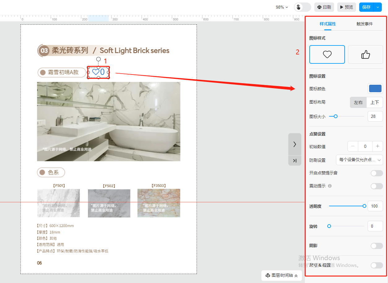 選中頁面上的點(diǎn)贊按鈕,設(shè)置點(diǎn)贊的樣式、透明度、位置和大小、旋轉(zhuǎn)。