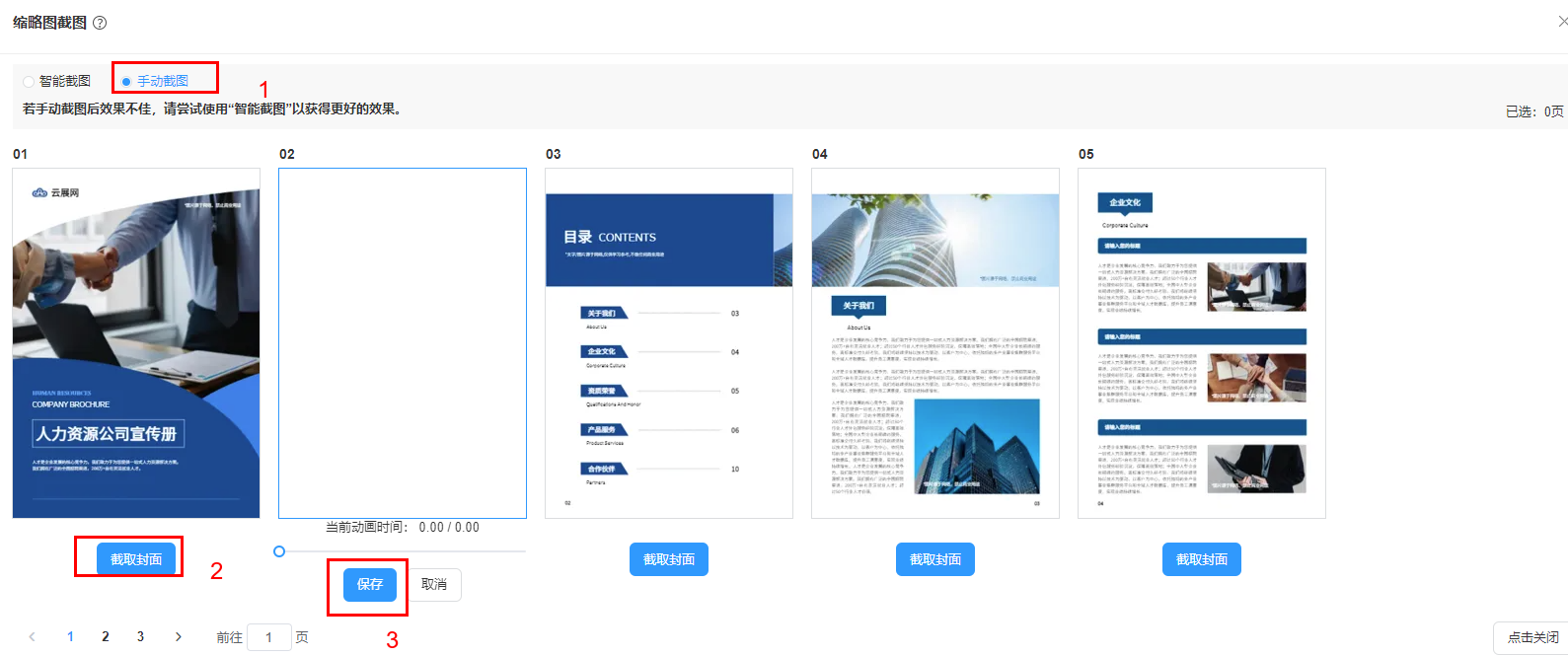 選擇【手動截圖】,點擊每張頁面下方的【截取封面】,并點擊保存,即可完成截圖。