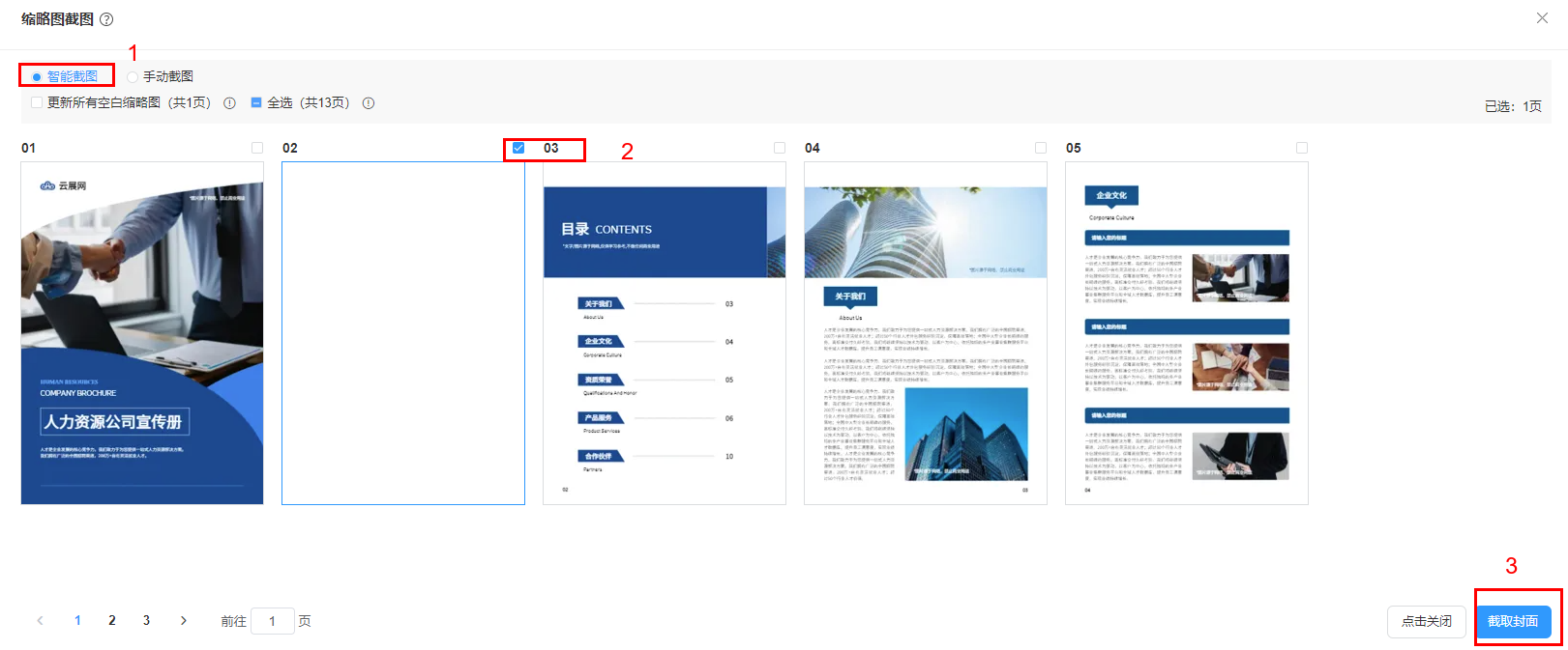 選擇【智能截圖】,勾選你需要截圖的頁面,點擊【截取封面】后,等待生成并截圖完成。