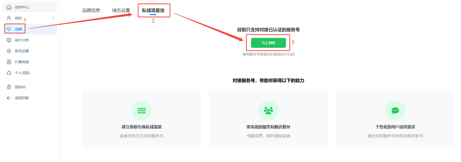 (1)點擊【品牌】,然后點擊【私域流量池】,點擊【馬上授權(quán)】。