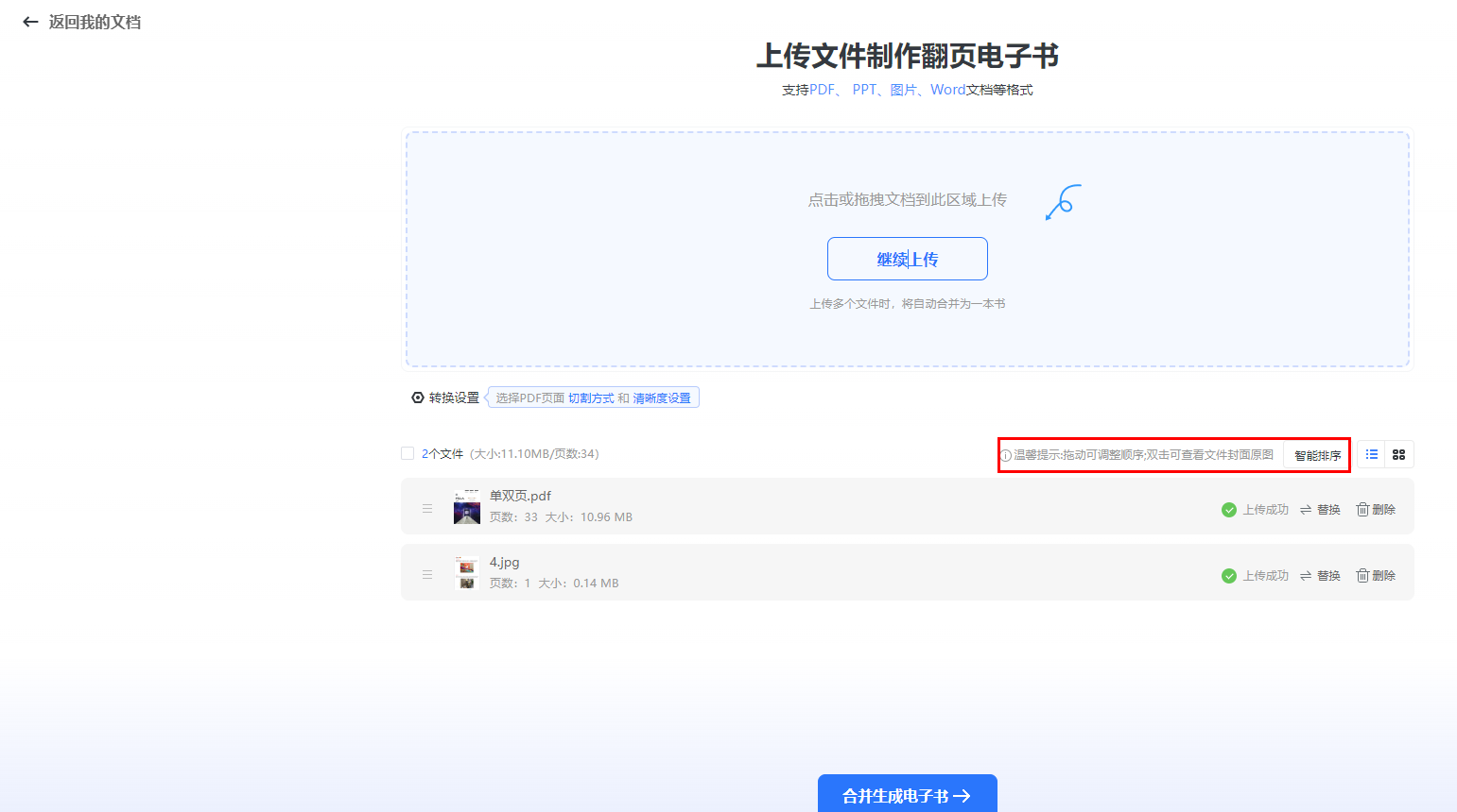 多個(gè)文件上傳合并為一個(gè)電子書,支持PDF/圖片/PPT/word格式。