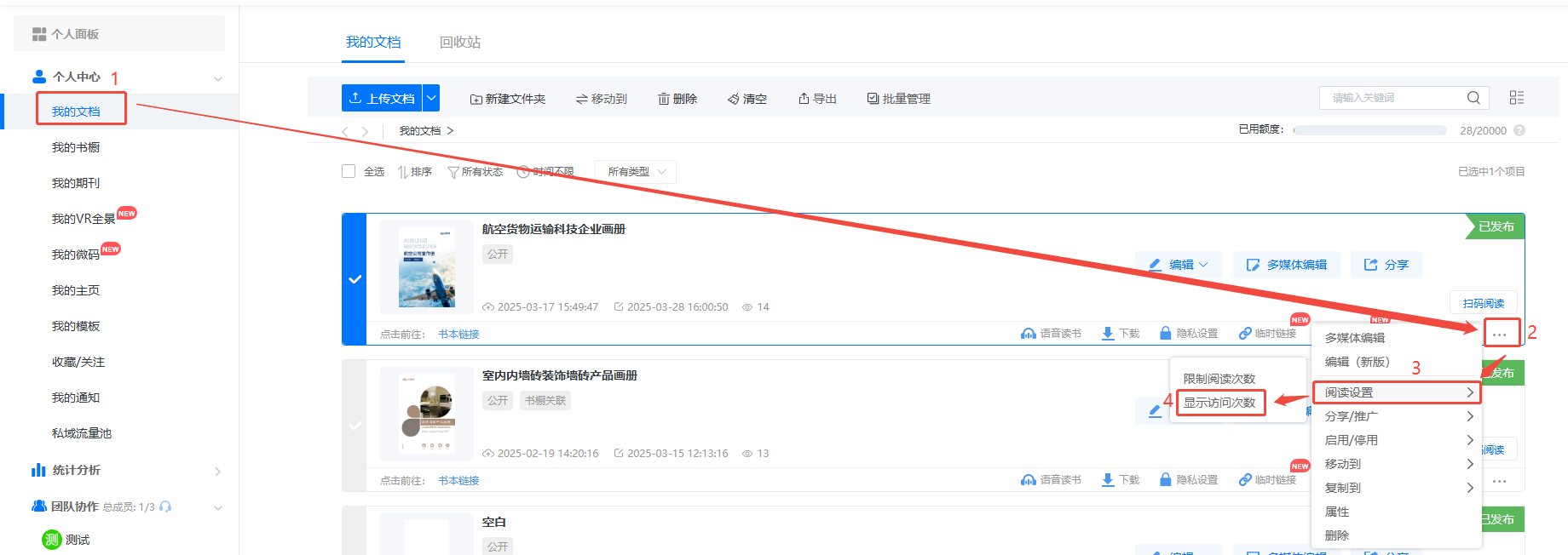 點(diǎn)擊【我的文檔】,找到需要設(shè)置的書(shū)本,點(diǎn)擊右邊三個(gè)點(diǎn),再點(diǎn)擊【閱讀設(shè)置】,最后點(diǎn)擊【顯示訪問(wèn)次數(shù)】。