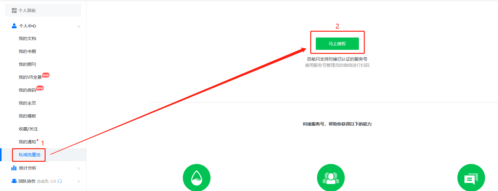 點(diǎn)擊私域流量池,再點(diǎn)擊馬上授權(quán),使用公眾平臺綁定的管理員個人微信號掃描二維碼進(jìn)行授權(quán)。