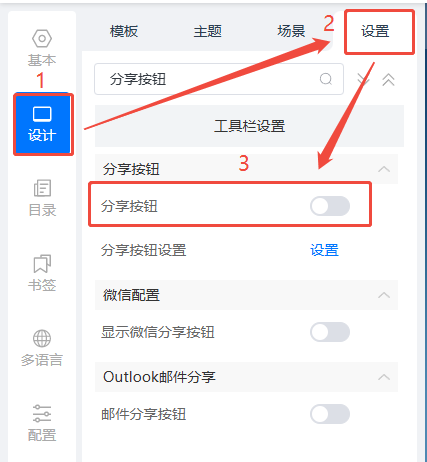 點擊【設計】,然后點擊【設置】,將【分享按鈕】關閉。