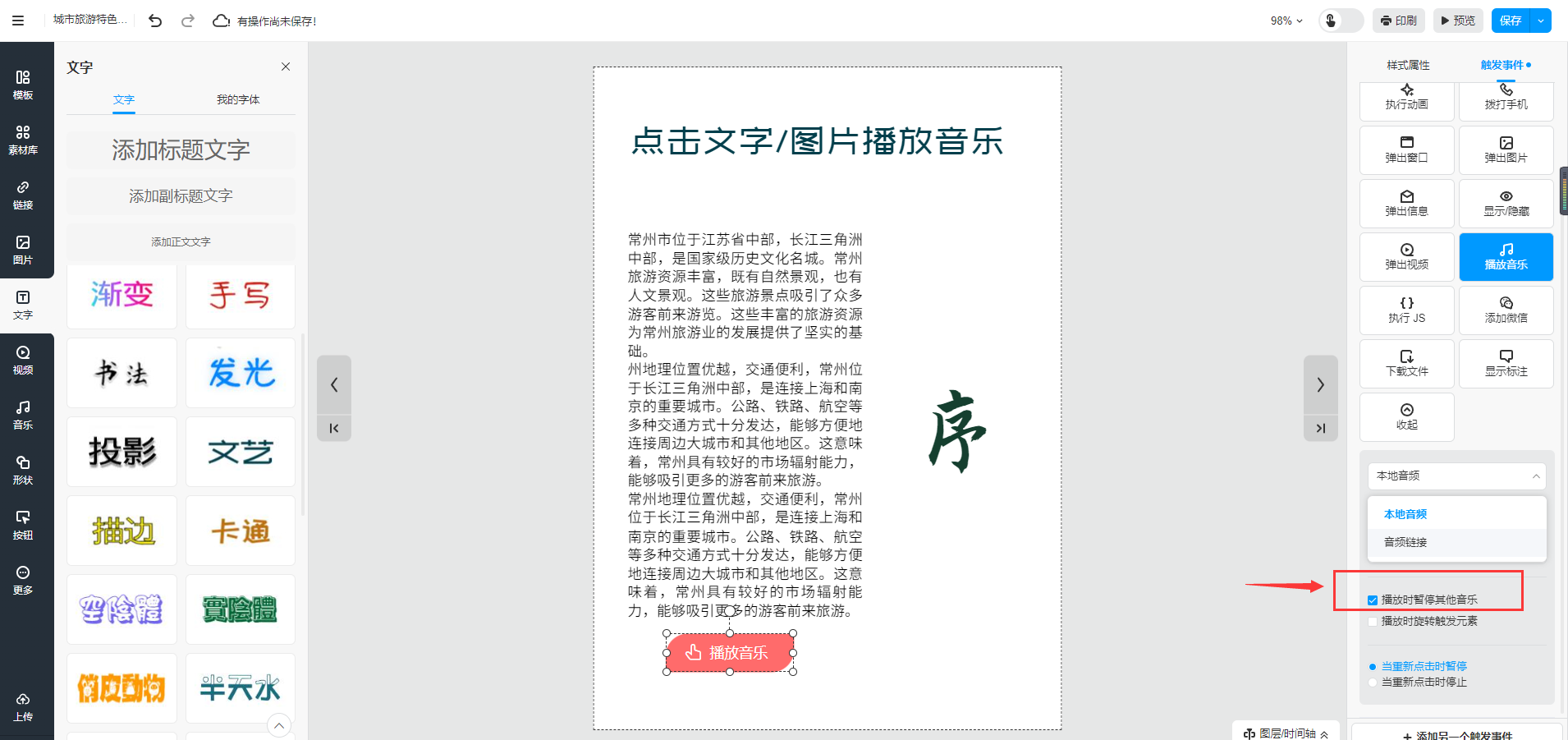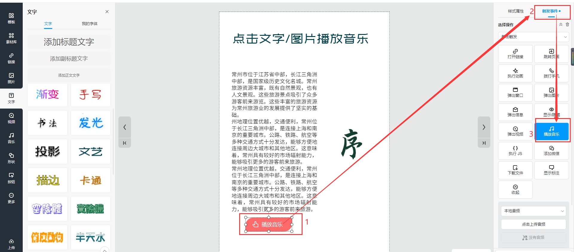 選中需要播放音樂的文字或者圖片,然后點(diǎn)擊【觸發(fā)事件】選擇【播放音樂】