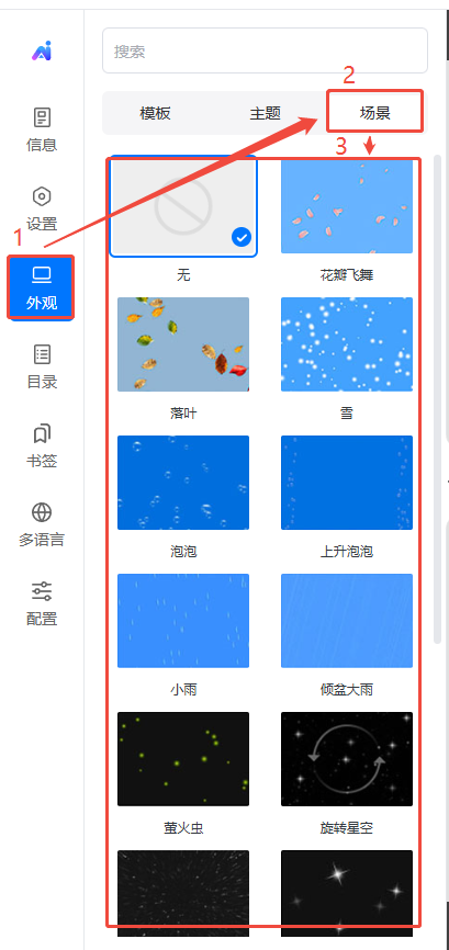 點(diǎn)擊【外觀】,然后點(diǎn)擊【場景】,在下方選擇一個(gè)場景單擊應(yīng)用即可。