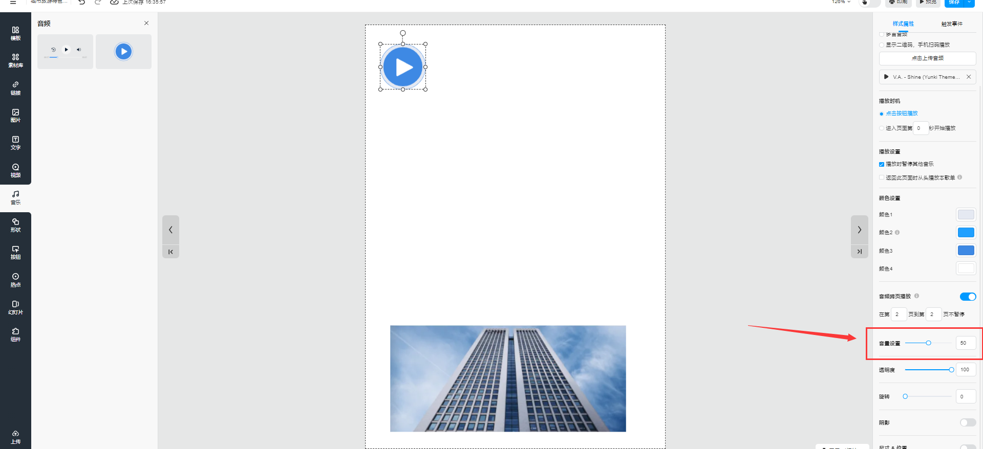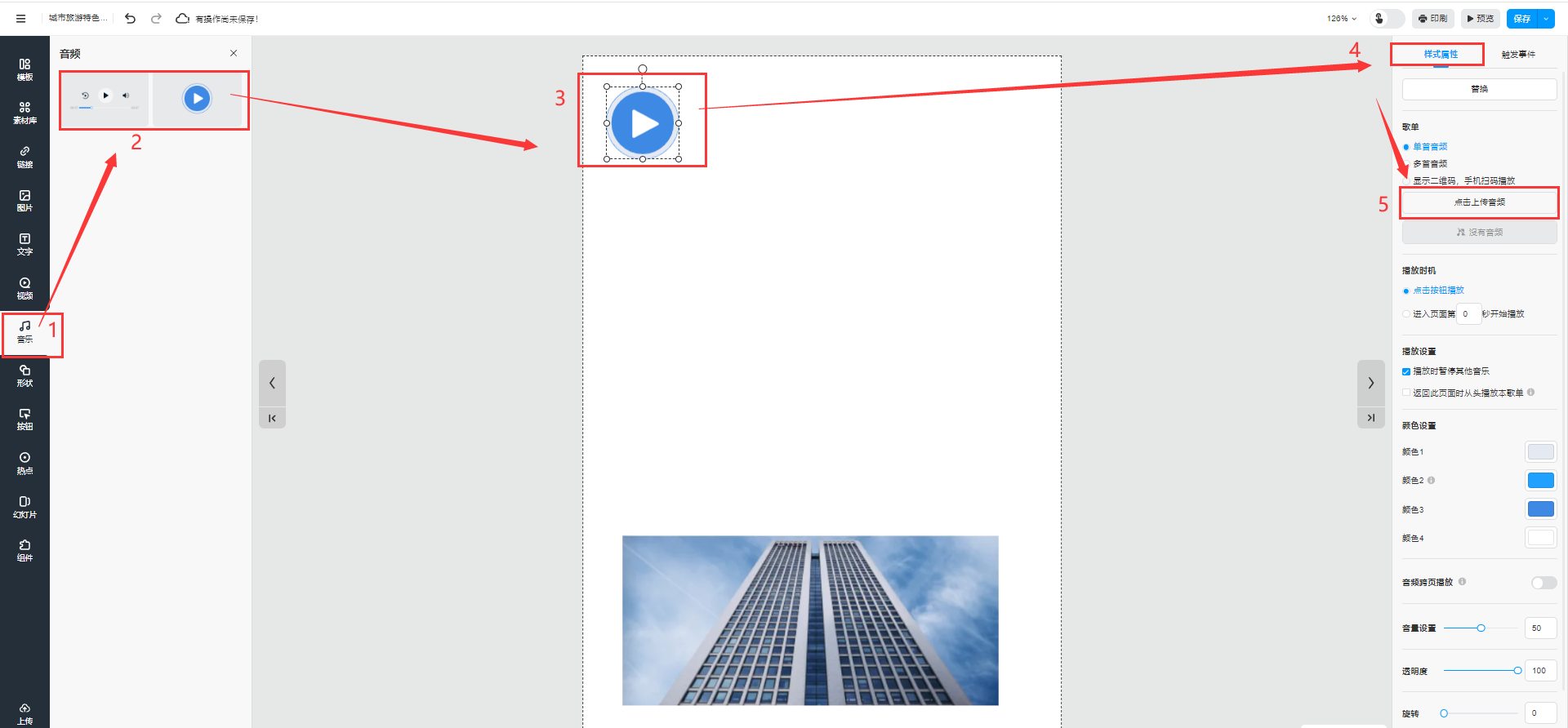 點(diǎn)擊【音樂(lè)】選擇音樂(lè)控件添加到頁(yè)面上,然后點(diǎn)擊【樣式屬性】,點(diǎn)擊【上傳音頻】,上傳mp3格式的音樂(lè)文件