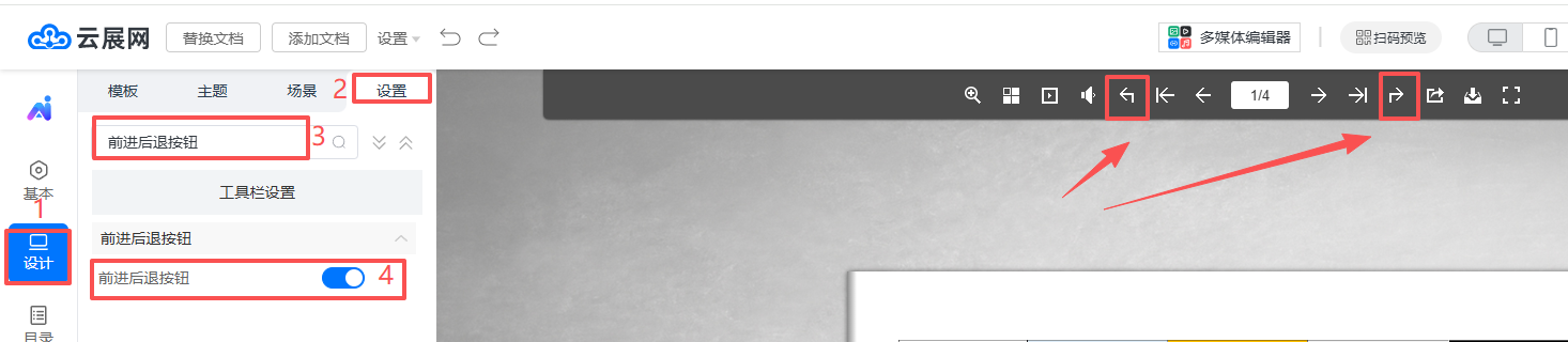 2.點擊設(shè)計,點擊設(shè)置,在搜索欄輸入“前進(jìn)后退按鈕”,設(shè)置為顯示。