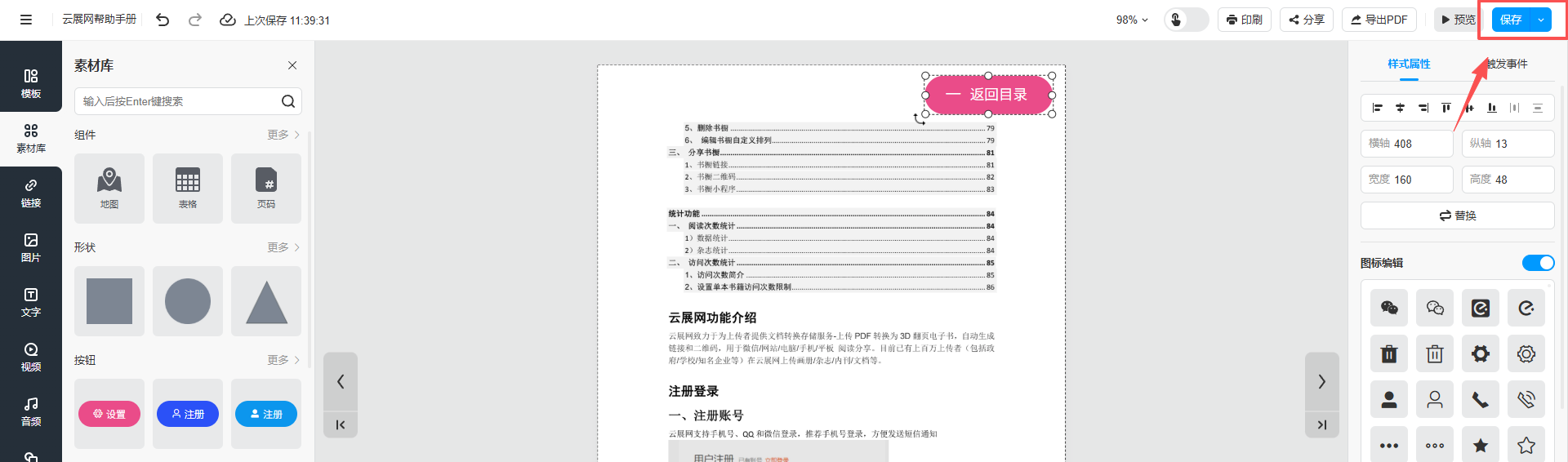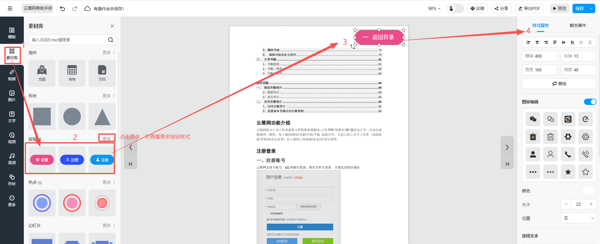 2、點擊【素材庫】,點擊按鈕,在頁面合適的位置添加功能按鈕,雙擊按鈕上的文字將其更改為“返回目錄”,右側(cè)可更改圖標(biāo)樣式和按鈕樣式。