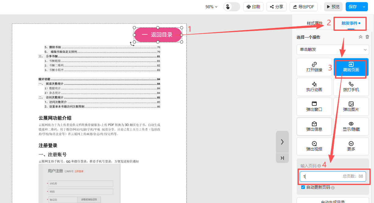3、點擊返回目錄按鈕,添加【跳轉(zhuǎn)頁面】的點擊觸發(fā)事件,跳轉(zhuǎn)頁碼為目錄的那一頁。