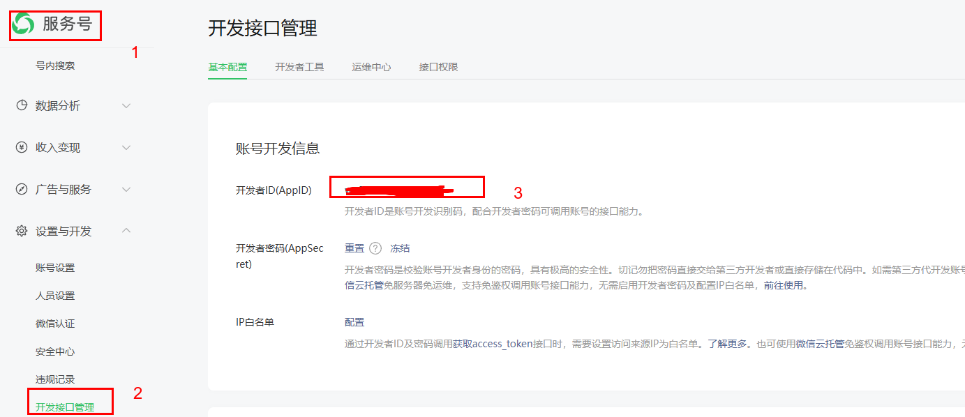 登錄你商戶(hù)平臺(tái)關(guān)聯(lián)的認(rèn)證微信公眾號(hào),點(diǎn)擊左側(cè)菜單【設(shè)置與開(kāi)發(fā)-開(kāi)發(fā)接口管理】;在右側(cè)面板找到開(kāi)發(fā)者ID(AppID)即為AppID。