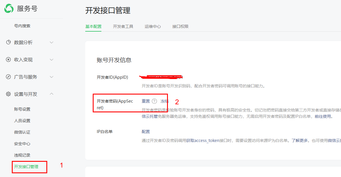 登錄你商戶(hù)平臺(tái)關(guān)聯(lián)的認(rèn)證微信公眾號(hào),點(diǎn)擊左側(cè)菜單【設(shè)置與開(kāi)發(fā)-開(kāi)發(fā)接口管理】;在右側(cè)面板找到開(kāi)發(fā)者密碼(AppSecret)即為AppSecret。