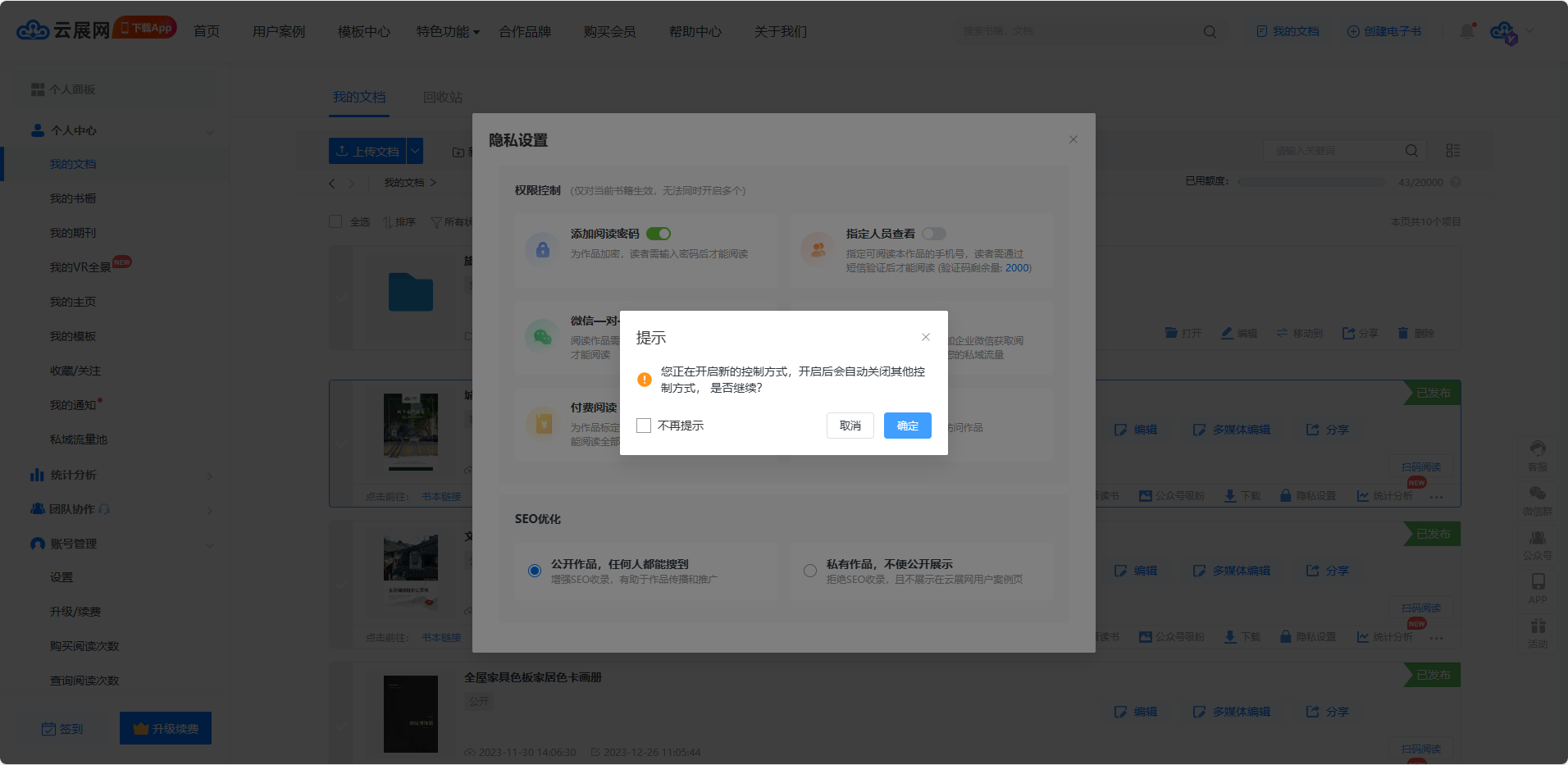 找到你需要設(shè)置微信一對一授權(quán)的電子書,點(diǎn)擊【隱私設(shè)置】,勾選【微信一對一授權(quán)】彈出彈窗后,根據(jù)你的需要勾選選項,點(diǎn)擊【確定】即可。
