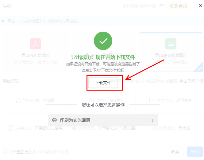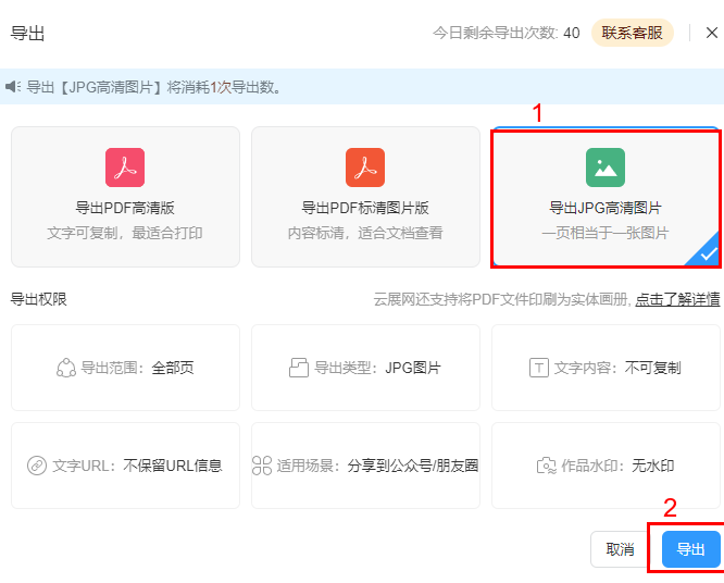 選擇【導出JPG高清圖片】后點擊【導出】。該格式一頁對應一張圖片。