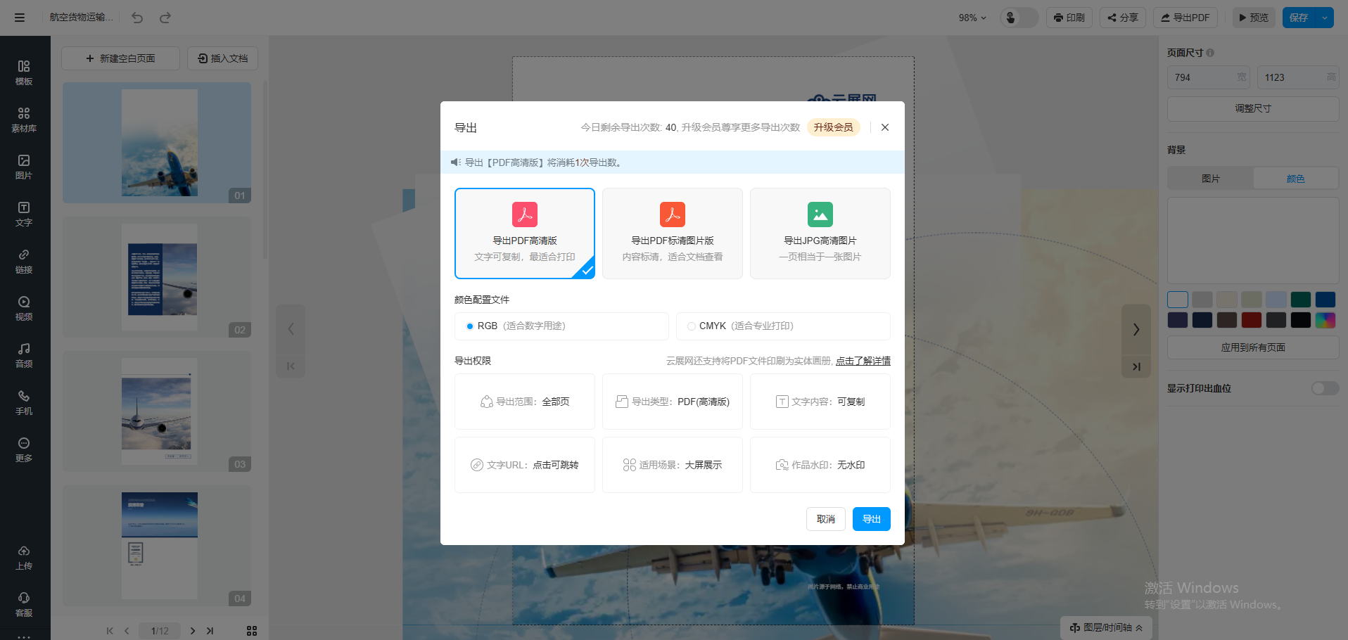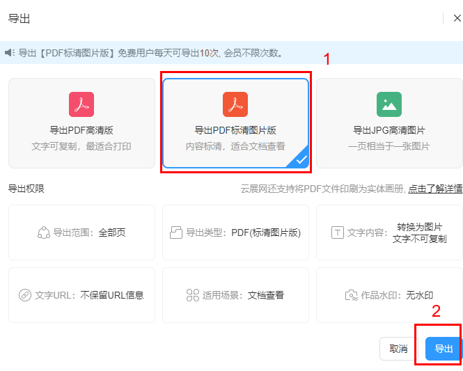 免費版用戶僅支持導出PDF標清圖片版,并帶有水印。購買會員可以去除水印。