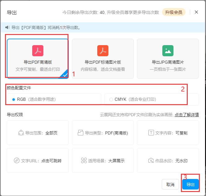 選擇【導出PDF高清版】,選擇【顏色配置文件】RGB或者CMYK,點擊【導出】。RGB配置適合數(shù)字用途,比如投屏,網(wǎng)上閱讀等場景;CMYK配置適合印刷。