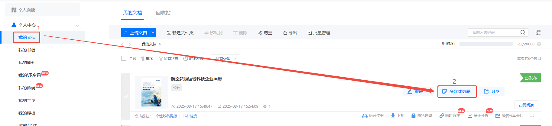 點進【我的文檔】/【文檔】,選擇對應電子書,點擊【多媒體編輯】/【內(nèi)容編輯】。