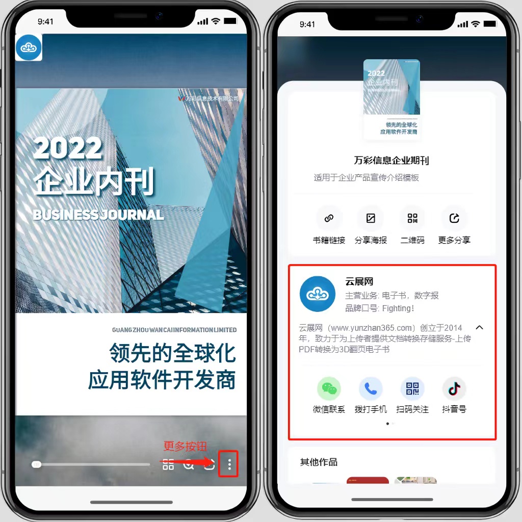 點擊電子畫冊的【更多按鈕】彈出品牌信息以及聯(lián)系方式