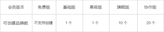 1)可創(chuàng)建品牌的數(shù)量跟據(jù)會員版本不同而不同,請看: