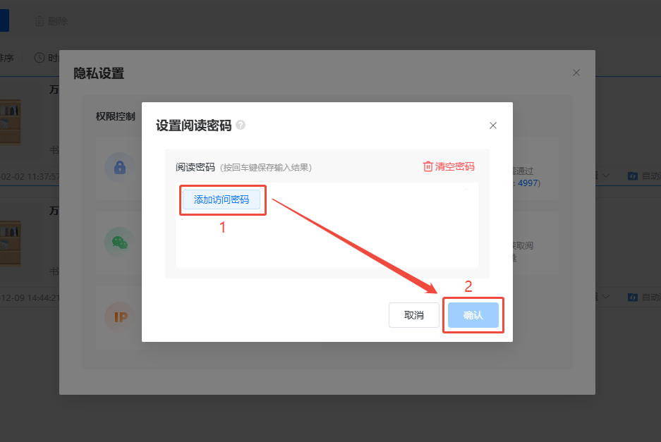 勾選【添加閱讀密碼】彈出彈窗,點(diǎn)擊【添加訪問(wèn)密碼】輸入密碼后點(diǎn)擊【確定】即可。