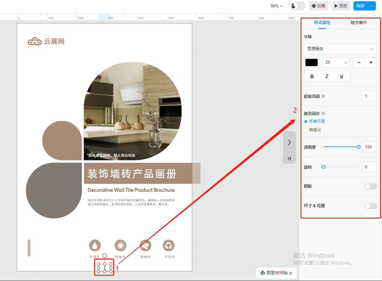 點擊某一頁的頁碼,在右側樣式屬性處可以設置頁碼樣式,可以選擇同步所有頁面的頁碼或者自定義頁面的頁碼。