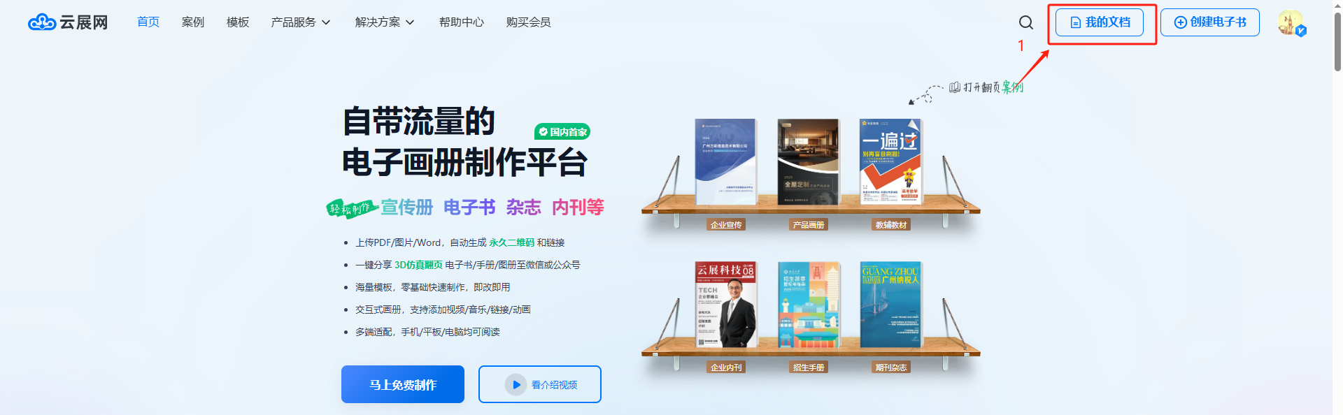 你可以從云展網(wǎng)首頁(yè)點(diǎn)擊【我的文檔】/【進(jìn)入工作臺(tái)】界面