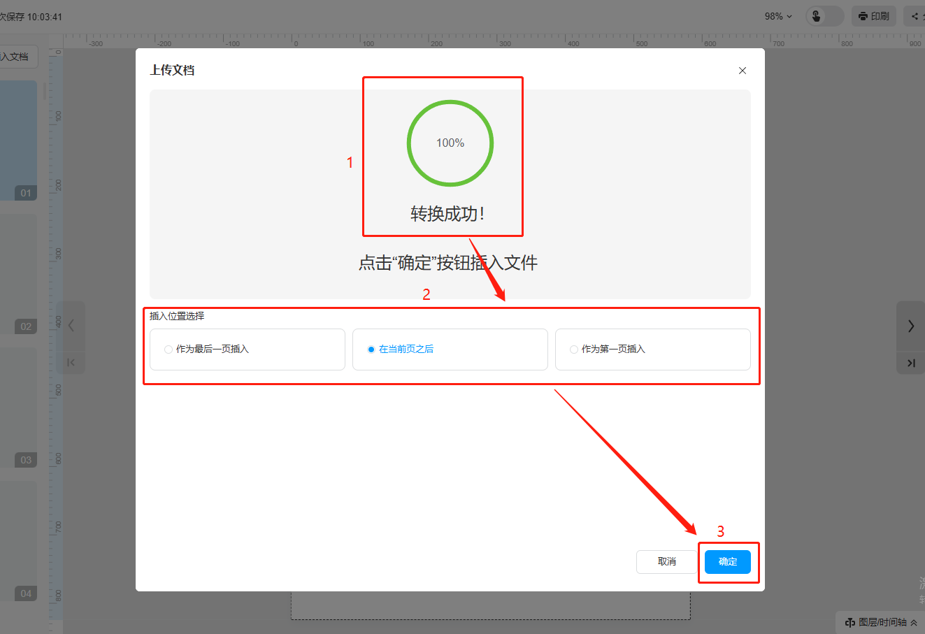 c)轉(zhuǎn)換成功后,選擇文檔插入位置,并點擊【確認】完成。
